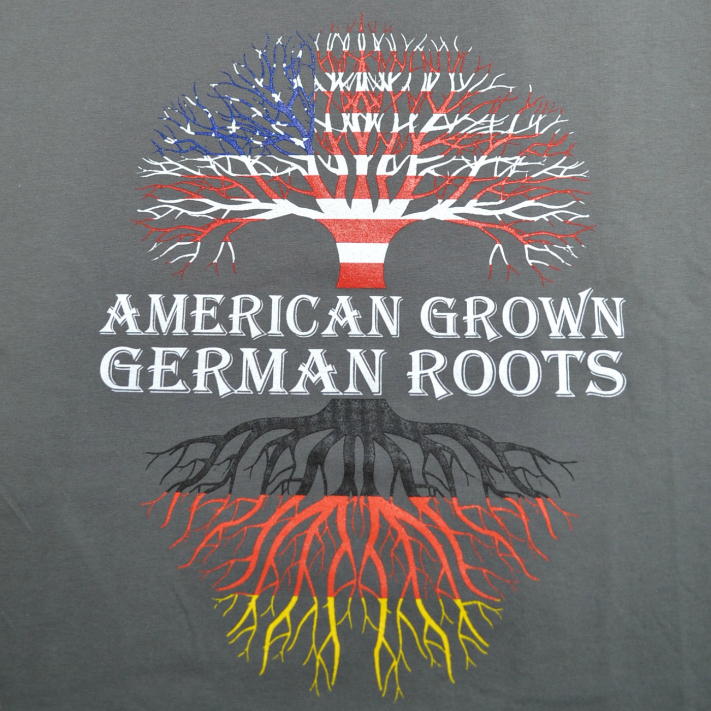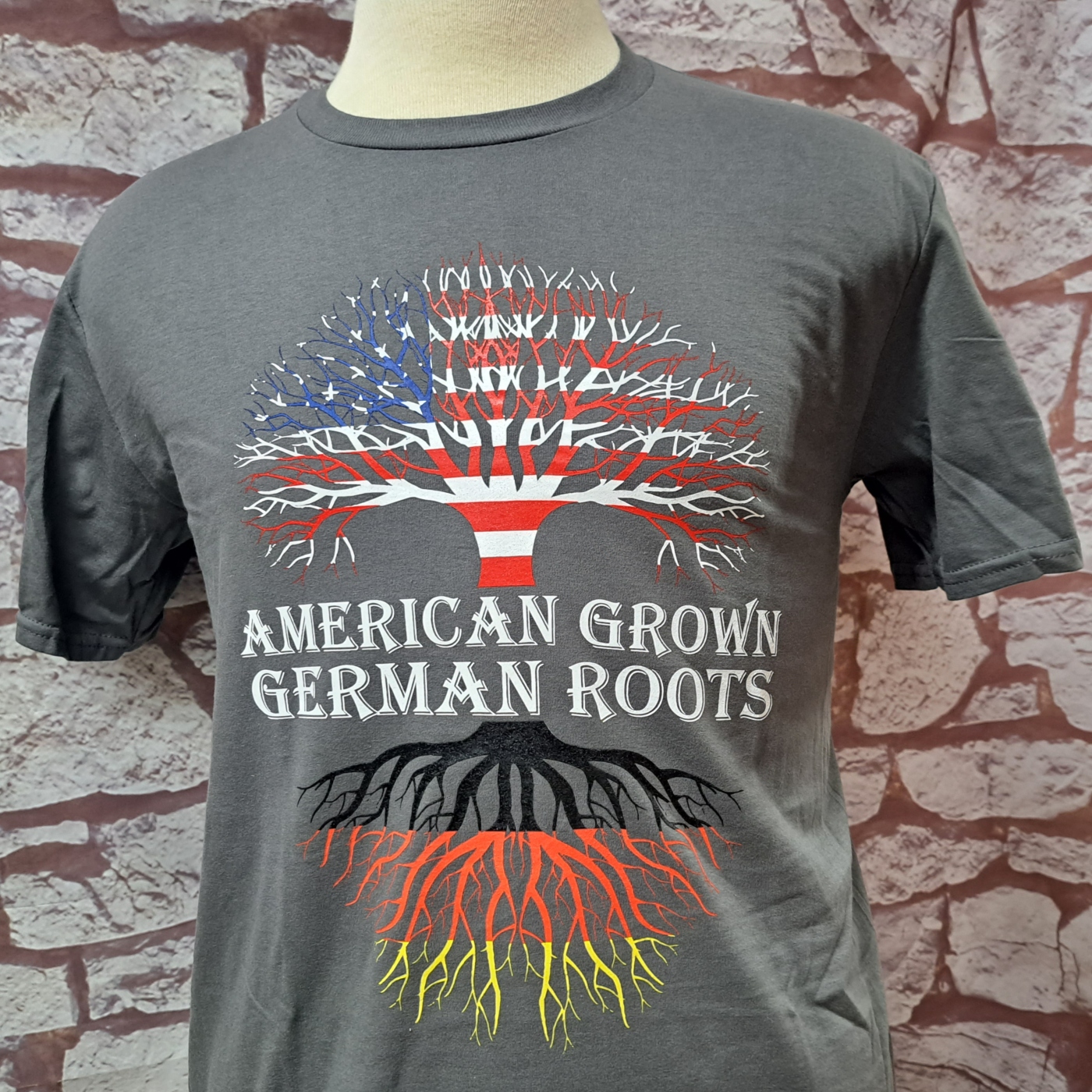 Shipping Not IncludedScreen printed American Grown, German Roots with Tree design on a short sleeve charcoal grey t-shirt. Imported shirt printed in the USA.