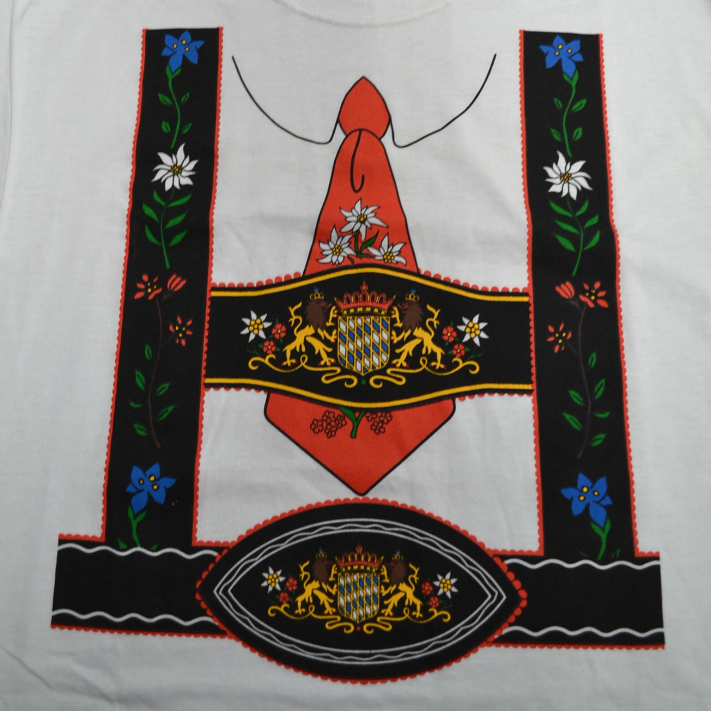 Screen printed German Suspender design on a short sleeve white t-shirt. Imported T-shirt printed in the USA.