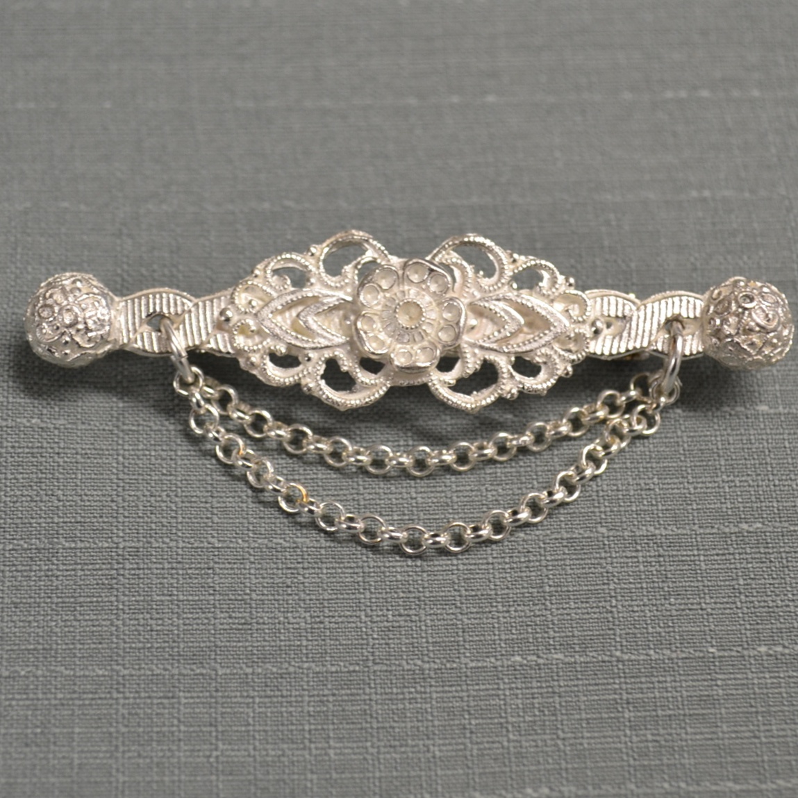 Shipping Not IncludedFiligree shawl pin with hanging chains in silver.