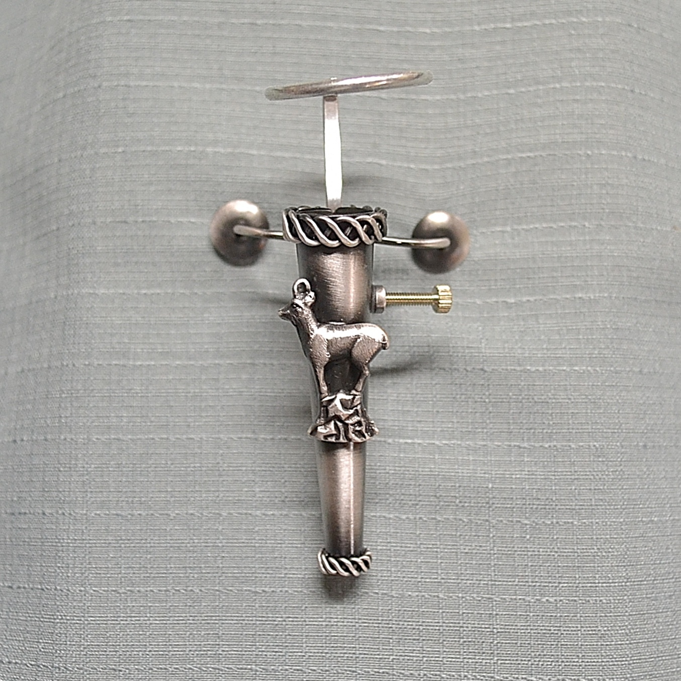 Shipping Not IncludedA silver plated gamsbart holder with stabilizing legs. Features a goat design on the front, and an adjustable screw. Holds a medium sized gamsbart.