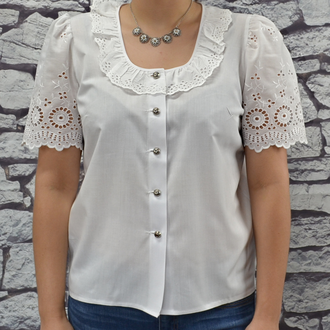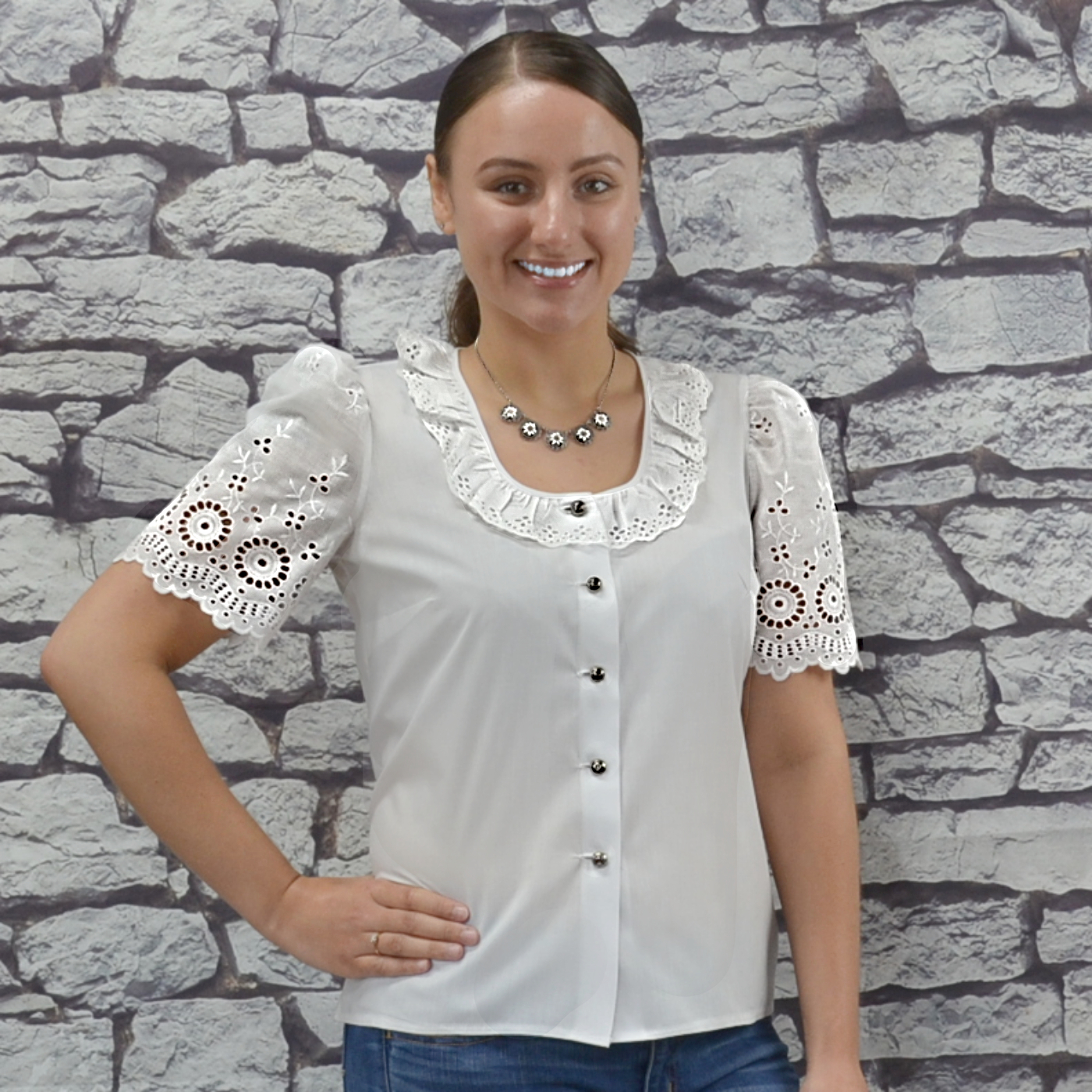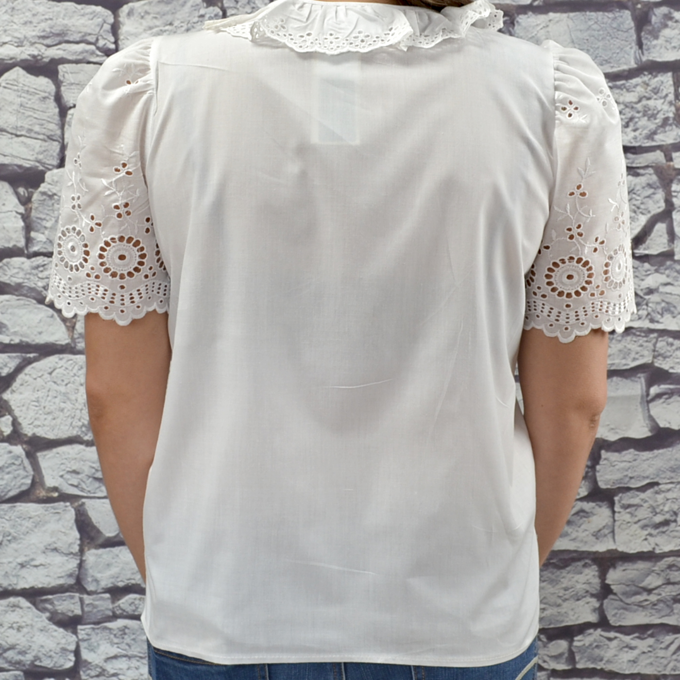 - Eyelet lace around the neck and sleeves