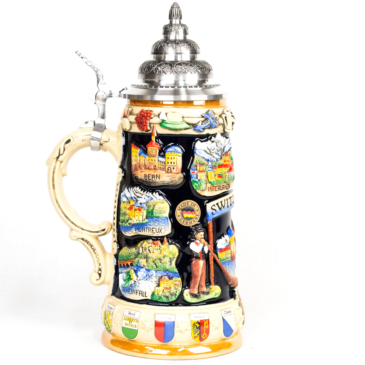 - On body of stein is a panoramic view of Switzerland cities
