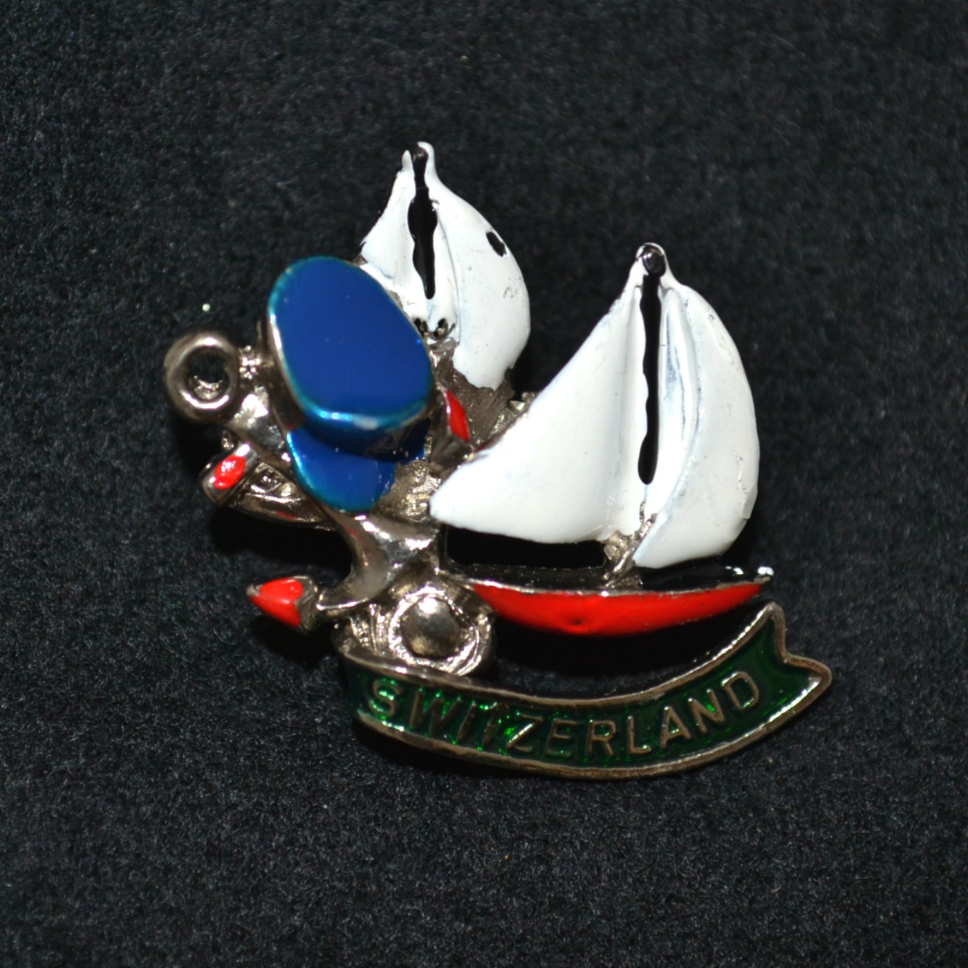 Painted sailboat pin with captains hat, anchor and “Switzerland” banner . Imported. Measures 1″ by 1 1/4″.