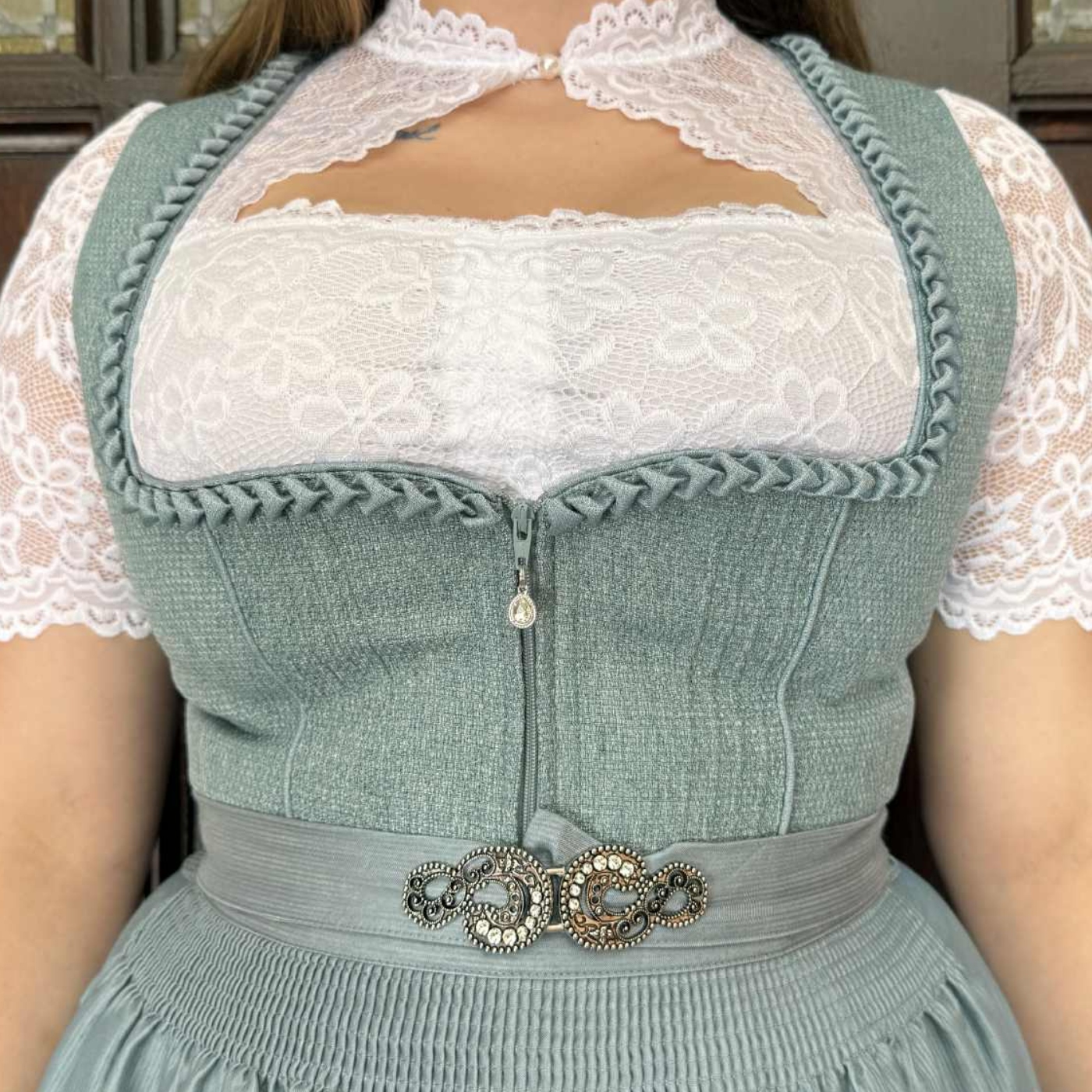 Step into a world of enchantment with the Alisia dirndl. The delicate details on the bodice and stunning bejeweled apron clip create a mesmerizing display, capturing attention at every turn.