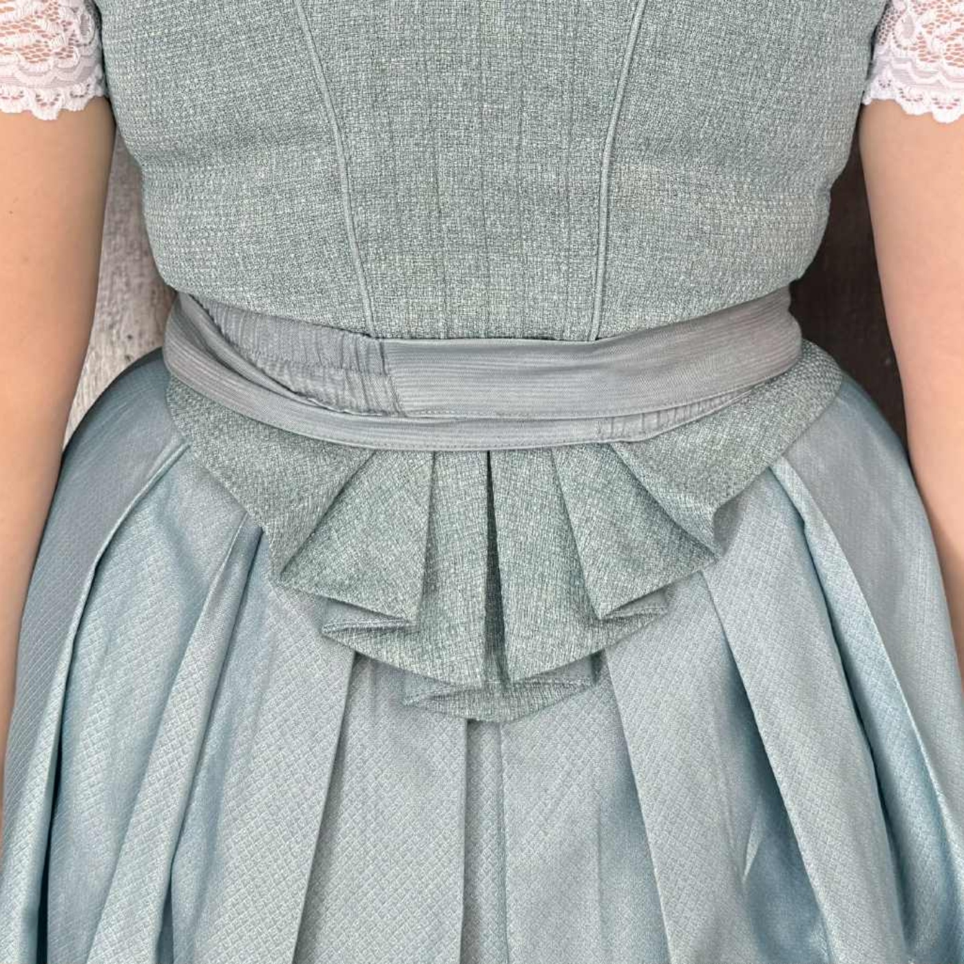 - Robin’s egg blue dirndl with elegant details along the neckline and on the front of the bodice