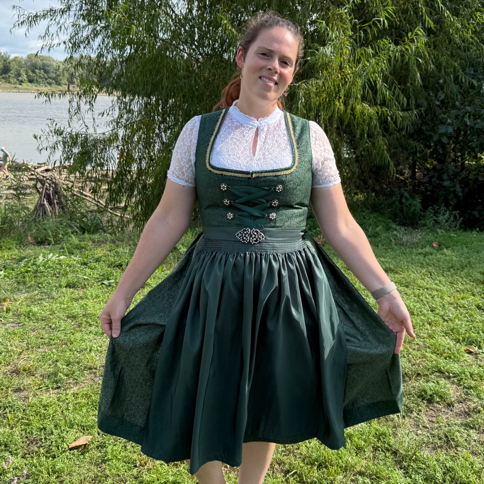 The Bettina dirndl features emerald and gold fabric and sequined circular bodice hooks.