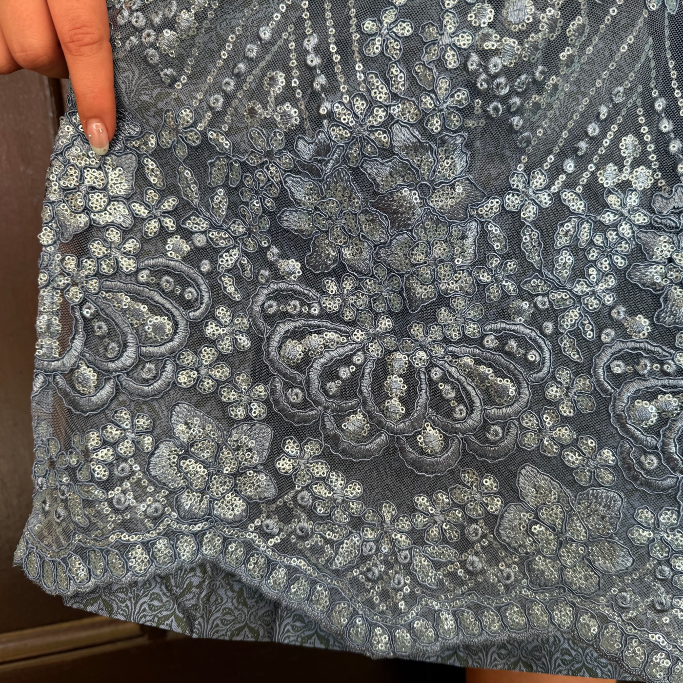 - Sheer apron included, features glittery sequins and embroideryÂ