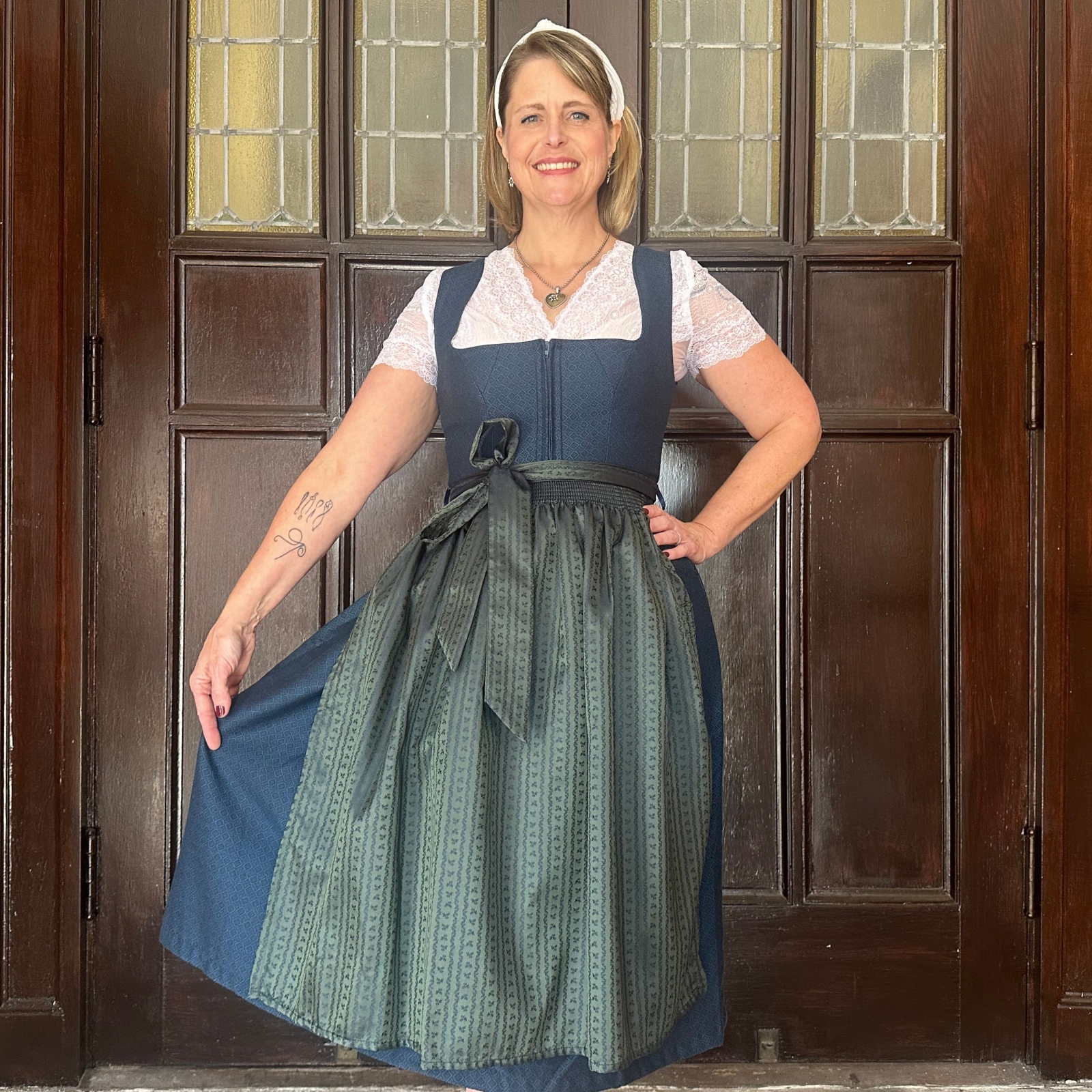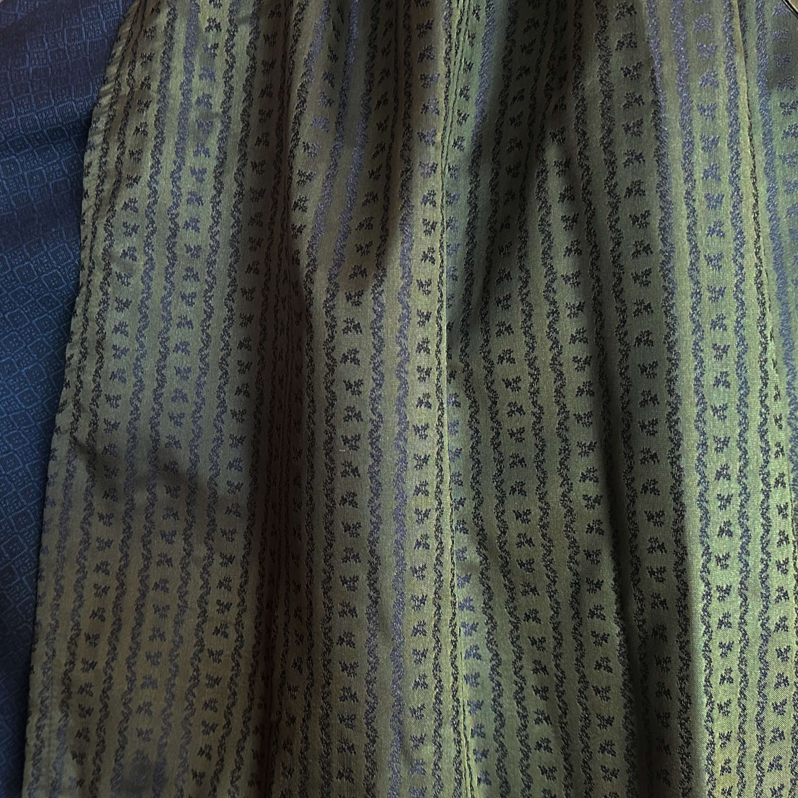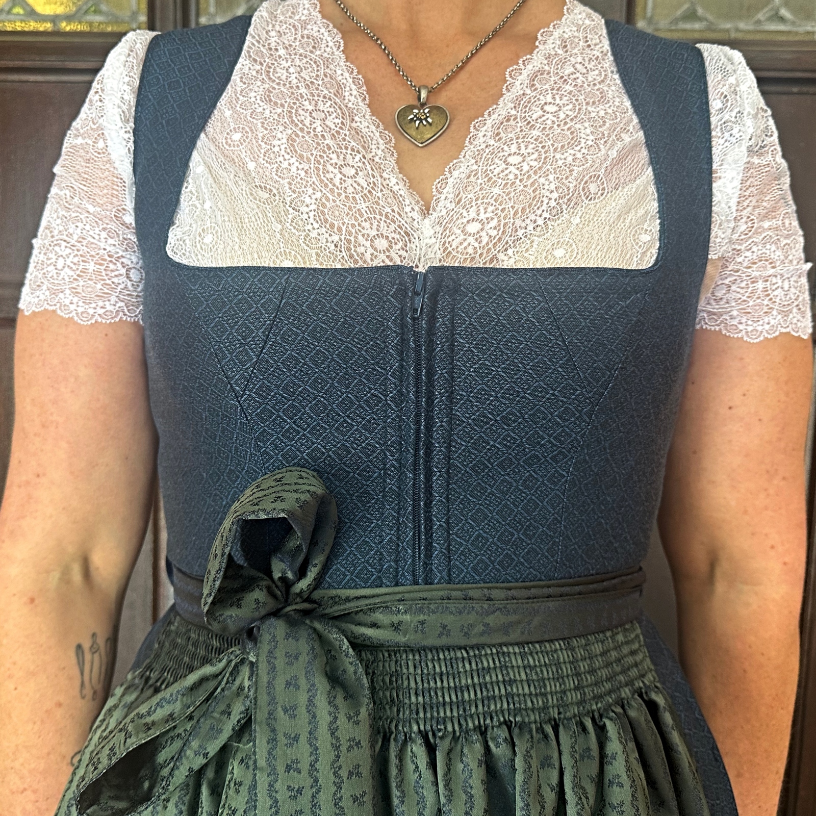 Shipping Not IncludedThe Olivia dirndl features a blue and black woven brocade in a diamond pattern. The green satin apron has a delicate blue design in vertical floral stripes.