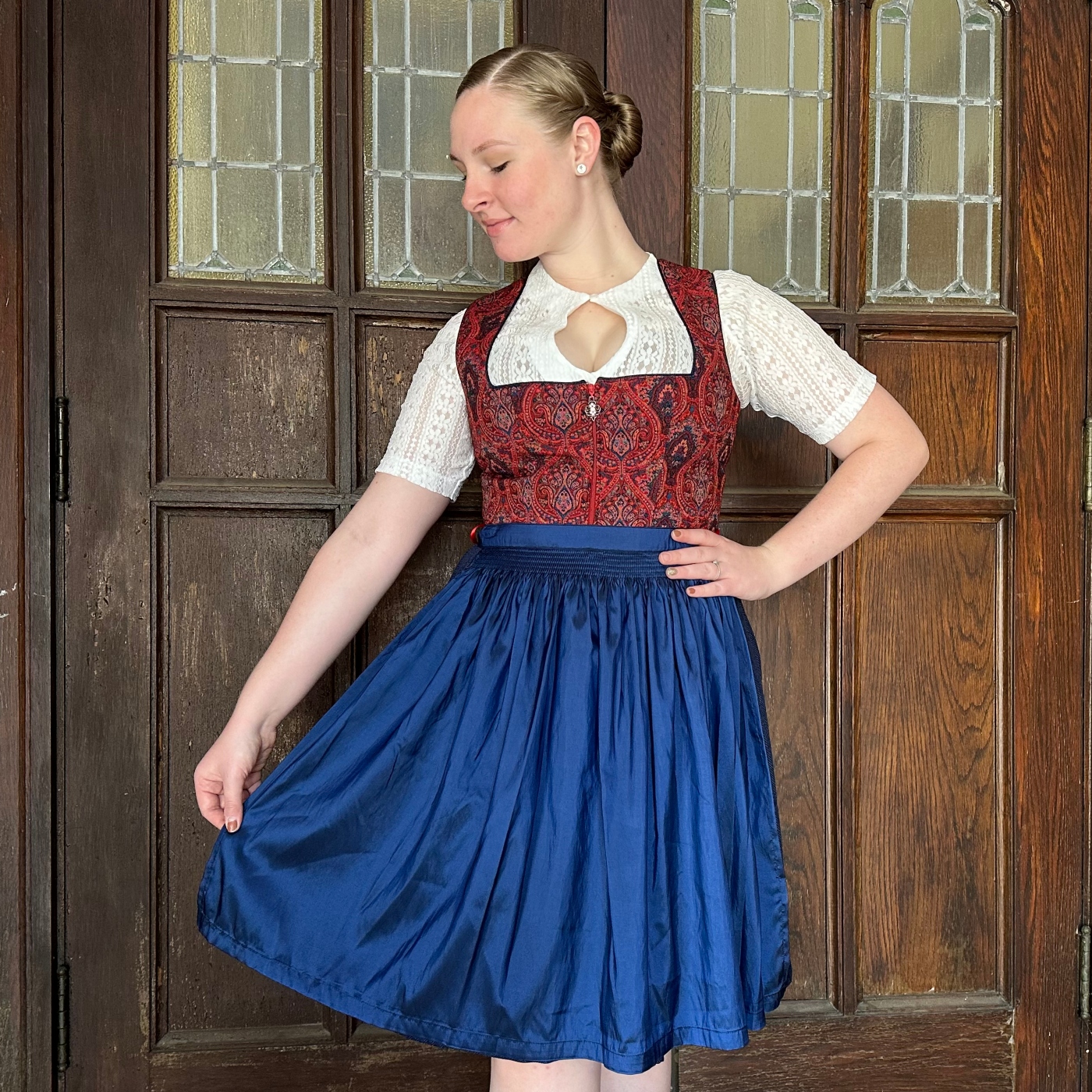 Step into a world of enchantment with the Ruth Dirndl. The blue and red patterned fabric of the dirndl is complimented by the elegant apron, capturing attention at every turn.