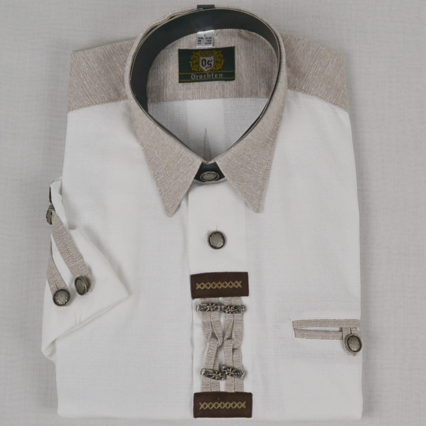 - Metal charms and tan/brown detailing on placket and sleeves