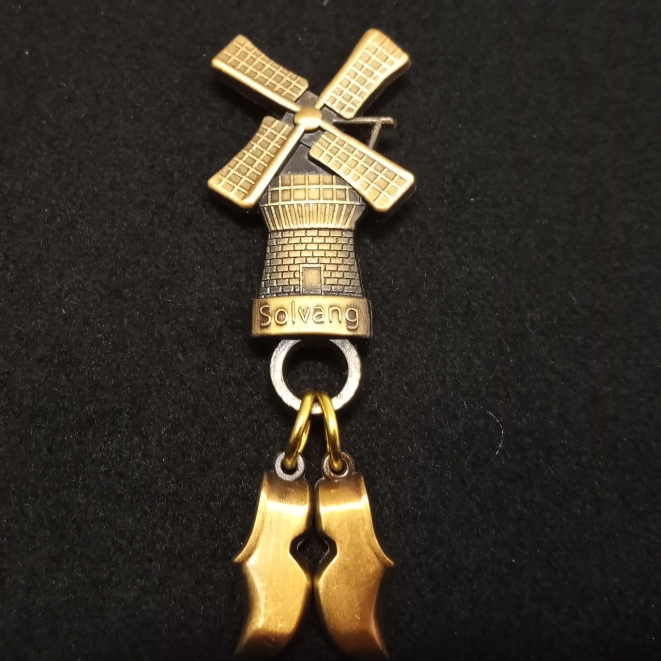 Windmill hat pin with hanging shoes and “Solvang” banner. Measures 7/8″ by 2 5/8″ .